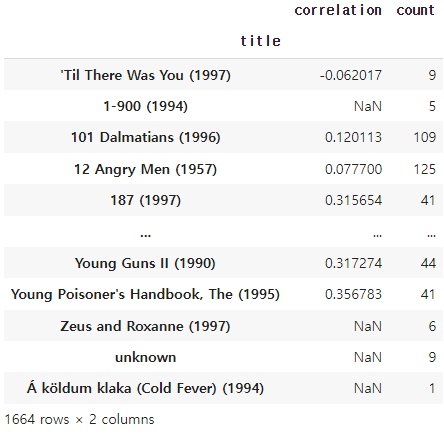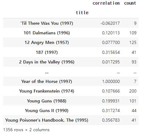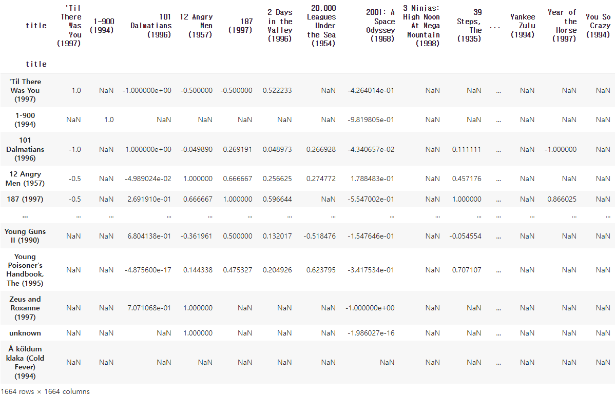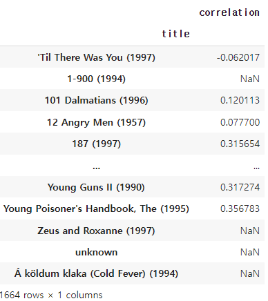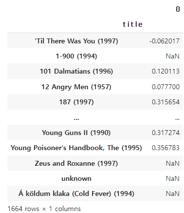 mugoori 2023. 1. 3. 12:47corr_titanic = df.corrwith( df['Titanic (1997)'] ).to_frame()