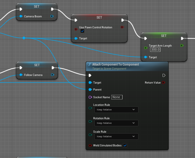Add Spring Arm Component , Add Camera Component 를 연결하고 타겟은 저장한 변수를 넣어준다